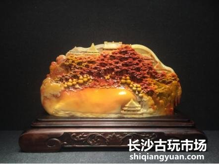 作品简介:作品采用上等封门红花冻石,运用多层次镂雕、浮雕、线刻等创作技法,以小见大,自上而下将金秋时节,红叶满山、层林尽染,楼宇隐现其间,葫芦满藤、瓜果飘香,以及游人在亭中观赏湖光山色的三大景象融入在一件作品中,意境分明而又和谐一体,令人赏心悦目,可谓构思奇巧、别具匠心。整件作品工艺精美、布局合理、匠心独运,是体现时节山水类作品中的珍品,具有非常高的观赏价值和收藏价值。
